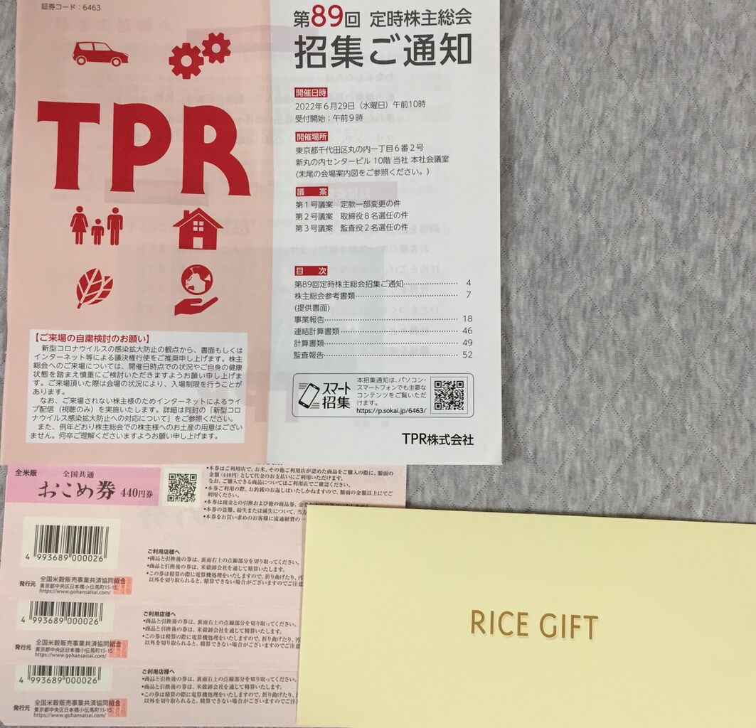 2022年06月21日 2022年6月 TPRから株主優待到着!お米券 コメント数:0 コメント カテゴリ:金券&ポイント by fly_bainushima TPRから株主優待到着しました。お米券3枚1320円相当です。美味しいお米を食べましょう。