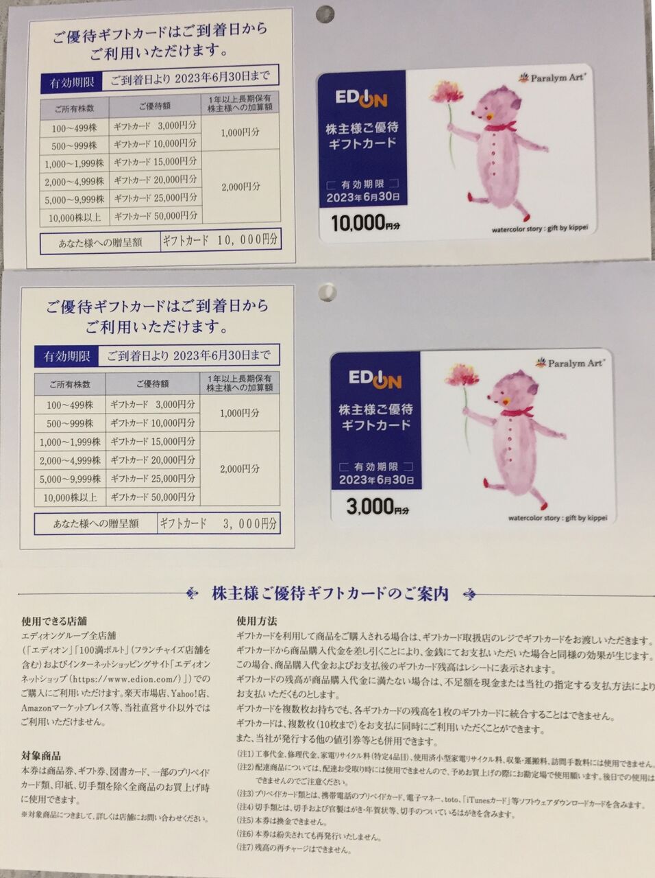 2022年06月21日 2022年6月 エディオンから株主優待到着 商品券13000円 コメント数:0 コメント カテゴリ:金券&ポイント by fly_bainushima エディオンから株主優待到着しました。10000円と3000円のギフトカードです。やー、太っ腹ですね。