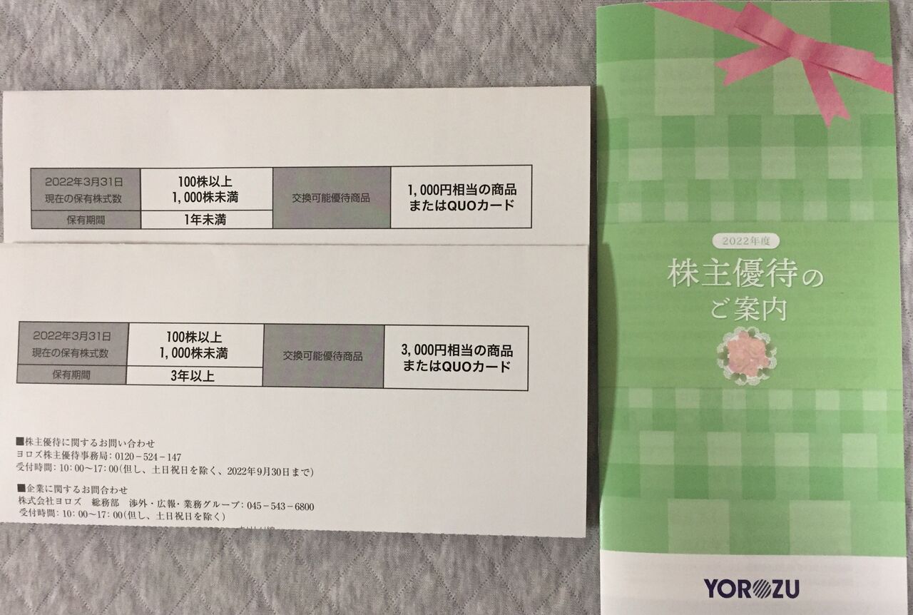 2022年06月21日 2022年6月 ヨロズから株主優待が到着 コメント数:0 コメント カテゴリ:クオカード by fly_bainushima ヨロズから株主優待が到着しました。1000円のクオカードと、長期保有の3000円のクオカードです。やった!