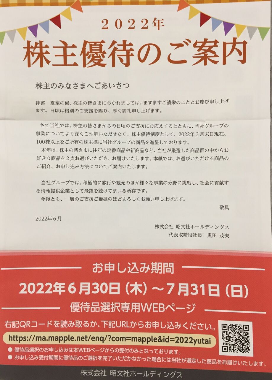 2022年07月15日 2022年7月 昭文堂ホールディングから株主優待到着 マップルもらえます コメント数:0 コメント カテゴリ:優待商品3月 株主優待 by fly_bainushima 昭文堂ホールディングから株主優待到着しました。マップルのシリーズがもらえます。3,000円相当の当社グループ商品ありがたいですね、楽しいですね、旅に出ましょう。
