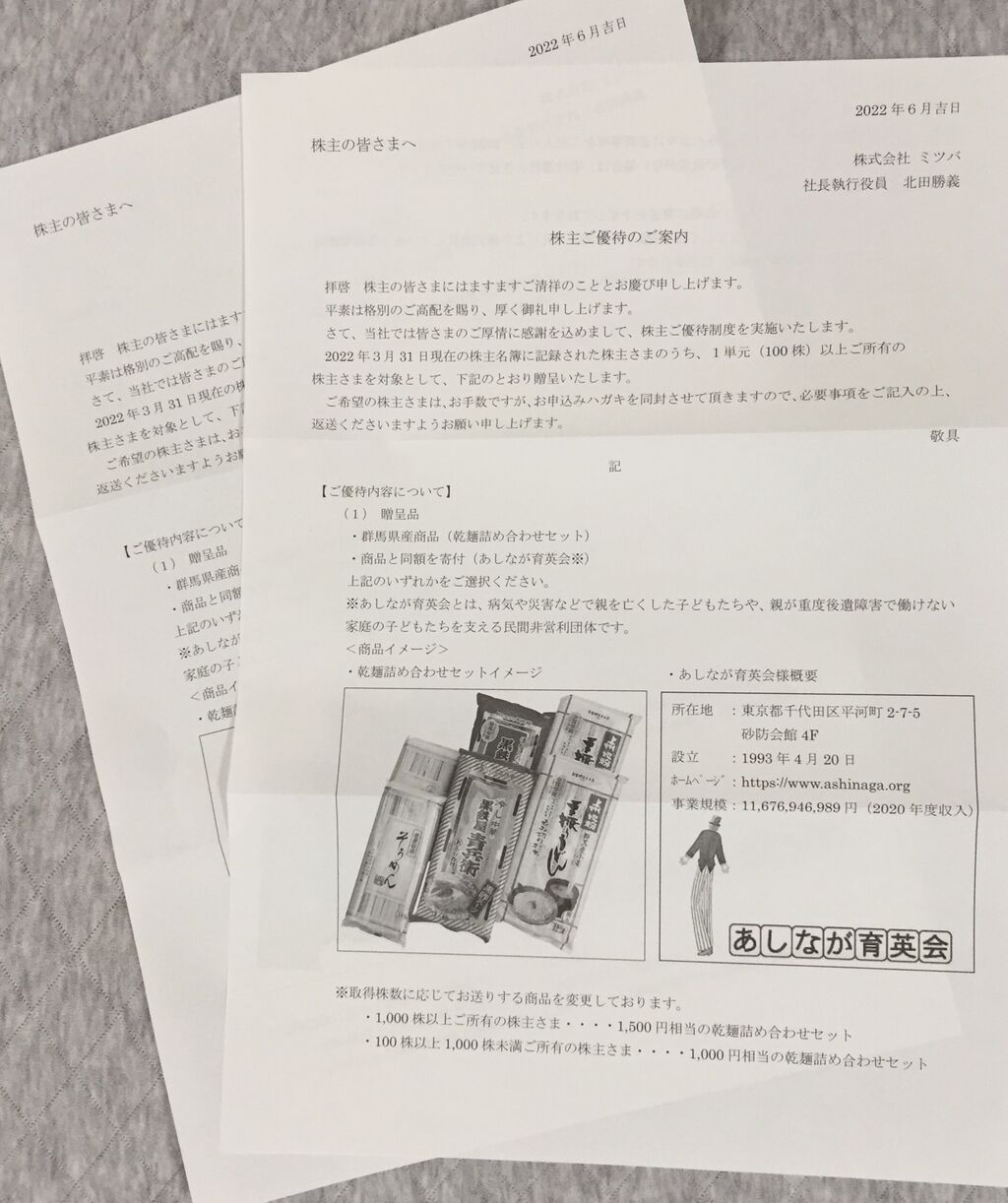 2022年07月30日 2022年6月 ミツバから株主優待到着 乾麺をチョイス!美味しいぞ コメント数:0 コメント カテゴリ:優待商品 by fly_bainushima ミツバから株主優待到着しました。商品カタログです。毎年群馬県産の蜂蜜だったのですが、今年は、乾麺です。一寸当てが外れましたが、美味しいかも。乾麺到着しました。食べてみたら美味しい!中身はぎっしりです。久しぶりの冷やし中華、冷や麦久しぶりにいただきました。美味です。