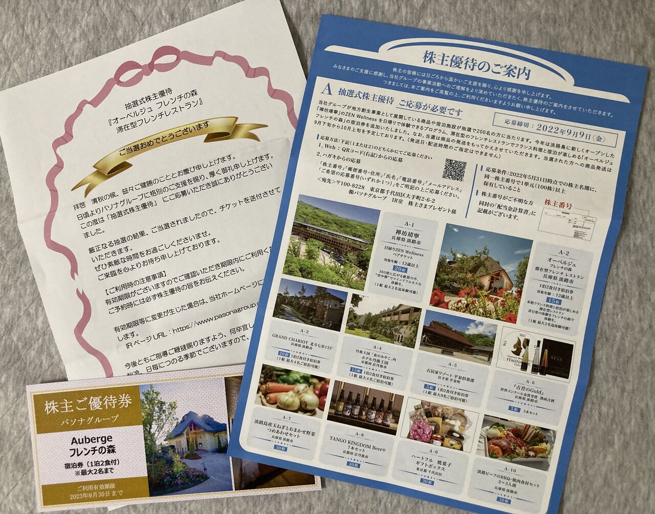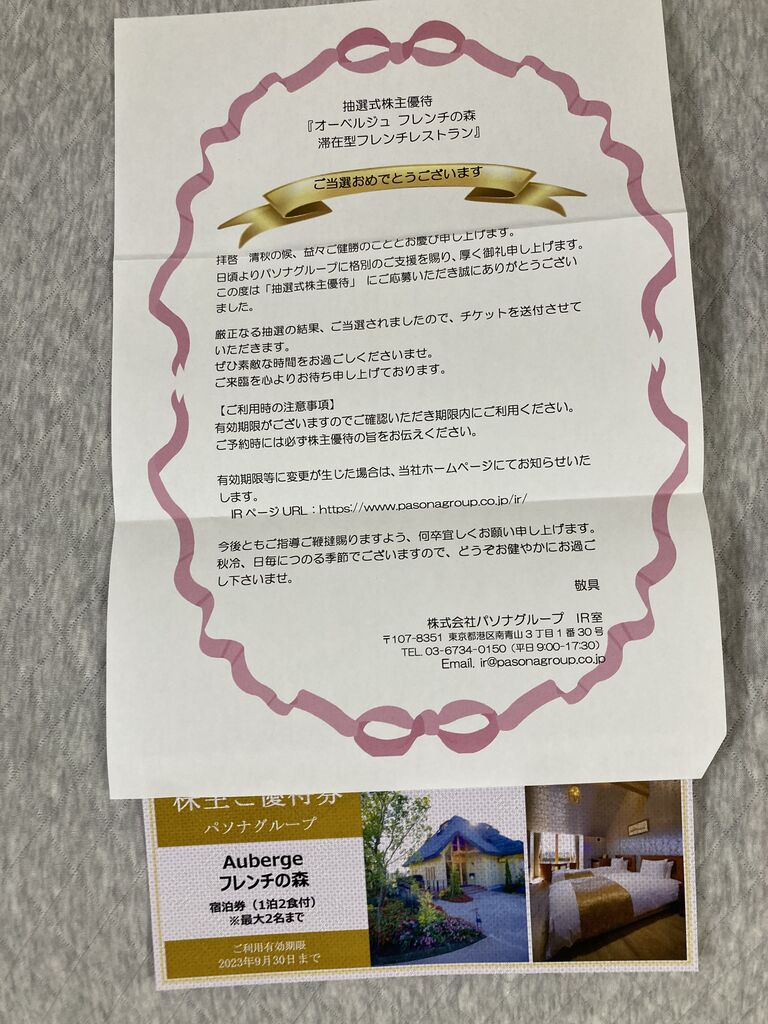 2022年10月29日 2022年10月 パソナから株主優待到着 大当たりでホテル宿泊券!! コメント数:0 コメント カテゴリ:優待商品 by fly_bainushima パソナから突然ですが、ホテルの宿泊券が送られてきました。株主から3名だけの抽選に当選です。オーベルジュ フレンチの森でフレンチのフルコースと一泊朝食付き2名分です。これは、すごいですね。ほぼ、5万円以上の価値があります。