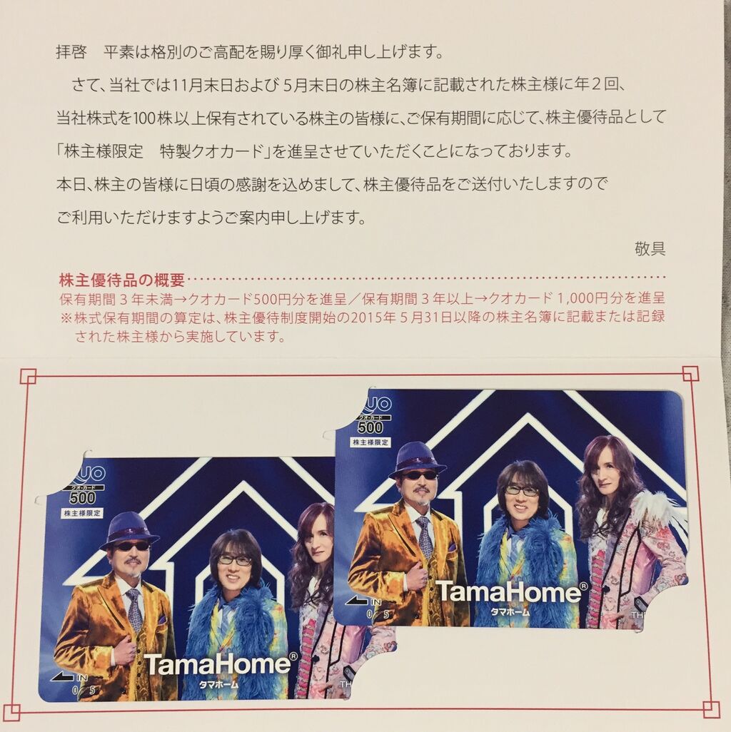 2022年01月31日 2022年1月 タマホームからアルフィーのQUOカード到着! 石の上にも3年!! カテゴリ:クオカード5月11月株主優待 コメント数:0 コメント by fly_bainushima タマホームから株主優待到着しました。クオカード1000円分です。石の上にも3年、ついに長期保有に到達して、500円のクオカードが2枚にアップグレードしました。長かったですねー今回は、特に素晴らしいのはQUOカードがアルフィーです。早速、ヤフオクでは、1800円から2000円で取り引きされてます。これまでの芸能人のQUOカードは、ほとんどプレミアムがつきませんでしたが、やっぱりアルフィーとなると違いますね。株主優待を始めた時に始めたので、あれから3年経ちました。今回のアルフィーのQUOカードは、良い記念になりそうです。